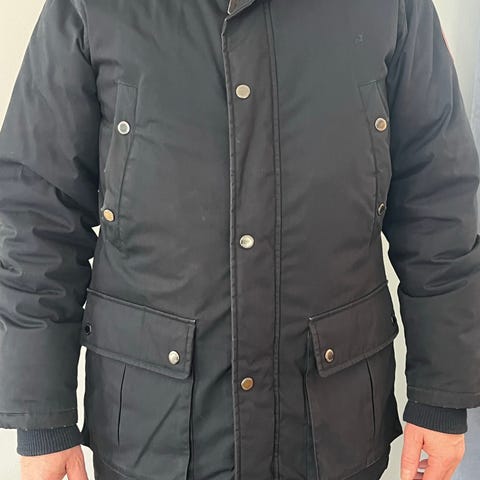 Redford vinterjakke i oransje farge, størrelse S for herre/ungdom. «Modellen» er 15 år, 170 høy og bruker str S til vanlig.
