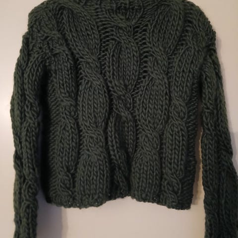 Genser i grønn farge, størrelse S for kvinner. Strikket materiale med tykk struktur og mønster. Egnet som overdel for kaldere vær.pris 800kr