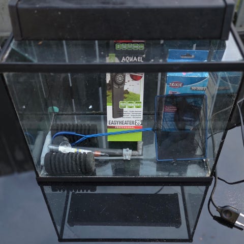 Pent brukt akvarium selges med lysrør, pumpe, varmekolbe og termometer. Håv, fiskemat, teststrips, guppy net breeder fåes med på kjøpet.
