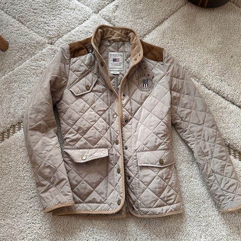 Lexington quilted jakke i størrelse XS, fargen beige. Jakken har quiltet design med detaljer i brunt materiale på skuldrene.