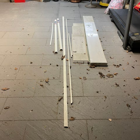 Stone Island stoffpakke bestående av bomull og polyester, totalvekt ca. 2 kg. Materialet kan benyttes til reparasjon eller produksjon av tekstilprodukter. Fargen på stoffet er hovedsakelig hvit med oransje emballasje.