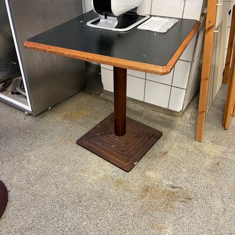 Sett med 4 bord med bordplate i massivt tre og svart metallunderstell. Bordene har en robust konstruksjon og passer til bruk i spisestue, kjøkken eller kontor. Hver bordplate har naturlig trestruktur og fargevariasjoner. Metallunderstellet gir stabilitet og moderne kontrast til treverket.