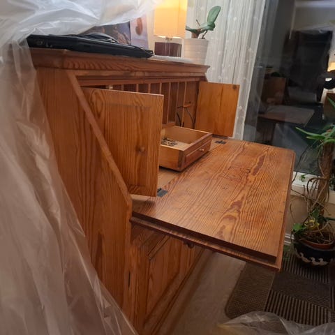 Meget pent og romslig skatoll og overskap med glassdører fra danske Allmue Møbler.