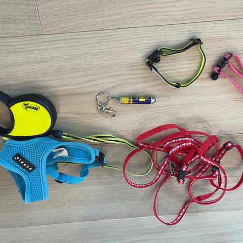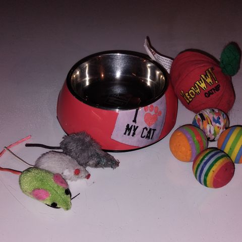 Et komplett sett til katten din. Settet inneholder leker, en skål, en sammenleggbar reiseskål, et bånd med sele, et halsbånd med strass, en slikkepott og spietspray . Alt for 200.