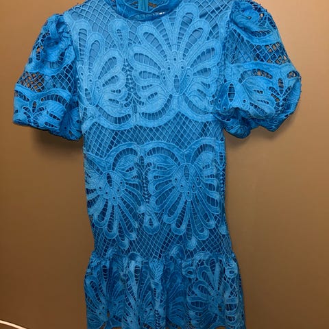 kjole til spesiell anledning i størrelse M og blå farge. Kjolen har et dekorativt, hullete mønster i stoffet med lange ermer og knappelukking bak. Den har en underkjole som sikrer dekning under det gjennomsiktige ytterlaget. Vakker blåfarge. Ligner kjoler fra Zimmermann, Love Lolina, Love Lolita, Malina. Lapp er tatt av, men den er ikke brukt.