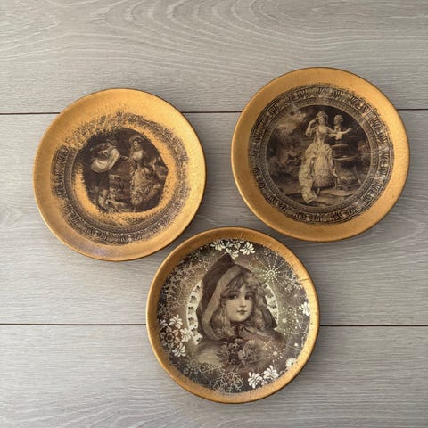 Selger 5 stk Carl Larson porseleensbilder med treramme. Bildene måler 21 cm i diameter, 25,5 inkl ramme. En beskrivelse av motivet på baksiden av bildene.