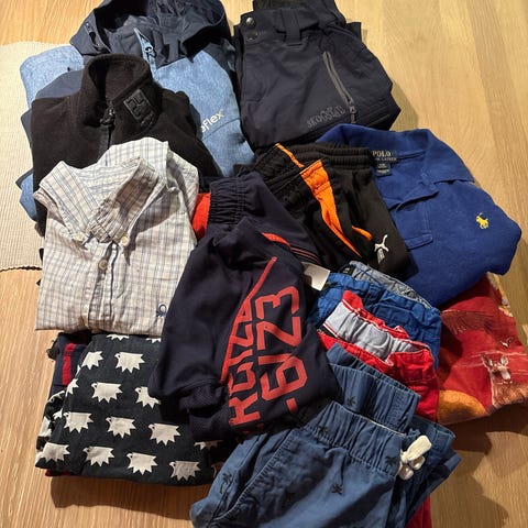 Klespakke til gutt med de fleste plagg fra størrelse 128 -140. Alt er pent brukt, med noen mindre bruksmerker, se bilder for detaljer :-)