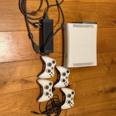 Microsoft Xbox 360 spillkonsoll selges. Dette er modellen med ekstra harddisk. Alle nødvendige kabler følger med. Det følger med tre kontrollere, men den ene trenger strøm fra kabel.