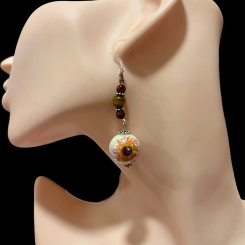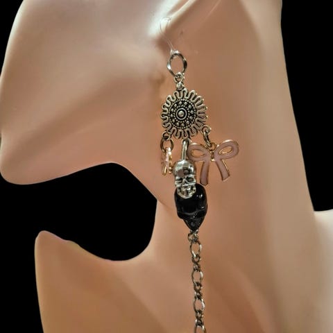 Nye og ubrukte! 925 stemplede stilige halloween eller goth punk øredobber! Med hengende ekte ferskvannsperle, rosa tigerøye krystall og svart onyx under disse rosa glass øynene som henger pent fra øreflippen! Skinner i lyset og er vanvittig kule og tøffe!