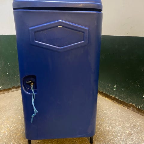 Stålskap brukt til oppbevaring av hesteutstyr og saler.