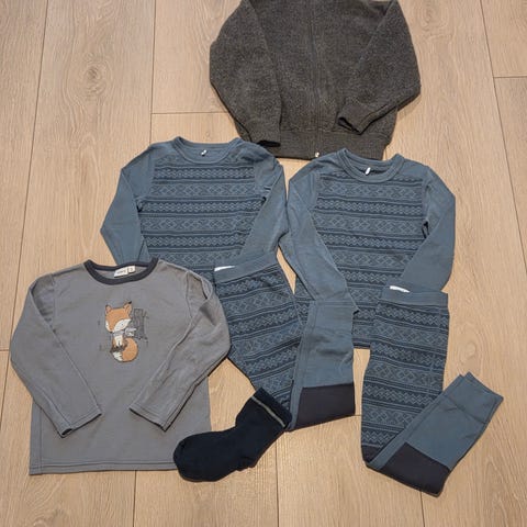 Godt brukte ullklær selges videre fordi det har blitt for smått. De fleste av plaggene har noen små anmerkninger, så dette passer nok best til barnehage, men det er mer bruk igjen i alt. Har forsøkt å vise anmerkningene med bilder. Størrelse 98-110