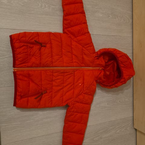 Lindex vinterjakke for barn i størrelse 128, unisex design. Jakken er rød og har en polstret, isolerende konstruksjon med hette. Jakken har reflekterende detaljer for økt synlighet.