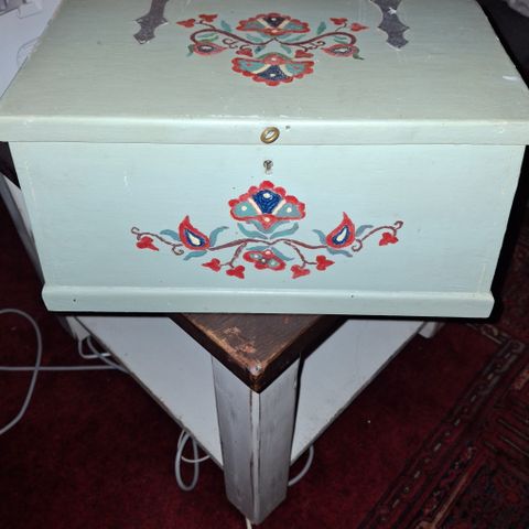 Antikt skrin ca 1920 utsmykket med pinnsvinsnåler. Noen av nålene er tapt over tiden som vist på bildene. Det mangler også nøkkel. Det vurderes alikevel pent brukt med tanke på alder. Skrinet ble kjøpt på antikvariat og dateringen er bekreftet.