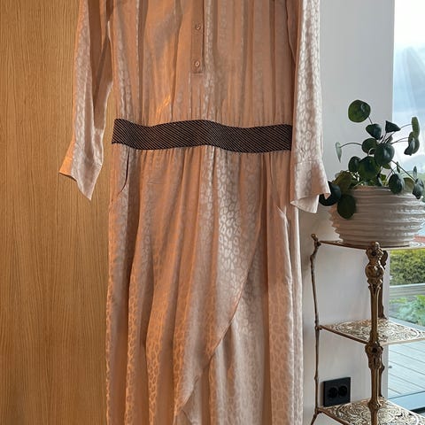 Nydelig kjole, brukt to ganger. Underkjole medfølger. Mønster sydd på i grått og sølvtråd. Selges siden den har blitt for stor.