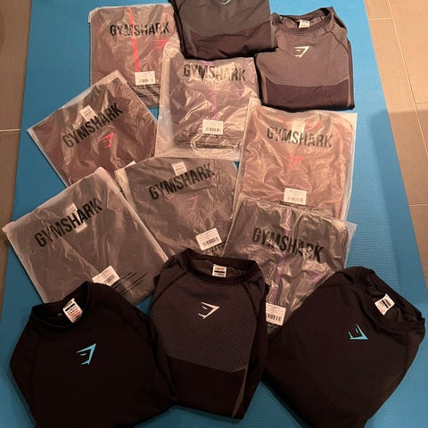 Selger par pent brukte Gymshark overdeler. Se hver enkelt for størrelse, farge og pris.