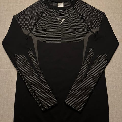 (Kan TRADE mot rød/blå) Gymshark Onyx 5.0 Seamless Long Sleeve T-Shirt i svart farge/ grå størrelse XS. Laget for menn, designet med sømløs konstruksjon for komfort og bevegelsesfrihet.