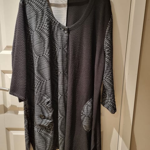 Lang cardigan fra Gozzip str. XL (54/56). Mål fra ua til ua er ca. 77cm. 10% ull. Fremstår som ny. Passer også de som bruker 48, 50 og 52. Blir bare litt Oversized til 48/50. Lommer og knapping i front. Selges for 300kr. Kan sende hvis kjøper betaler porto.