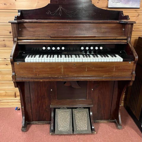 Antikk punpeorgel selges. Alder, bruk og andre spesifikasjoner er uvisst, men tilstanden virker grei.