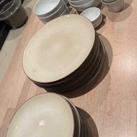 Opprinnelig fruktsett, men kan også brukes til asjetter. Ca 19cm diameter. Lite/ingen bruksmerker, men noe misfarging enkelte steder på trykket. Tror dette kommer av produksjonsmetoden, for har ikke vært i oppvaskmaskin.