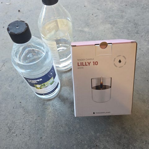 Lite brukt lykt fra Tenderflame. I børstet stål og glass. Stor kanne ( nesten full) med Tenderflame fuel følger med.