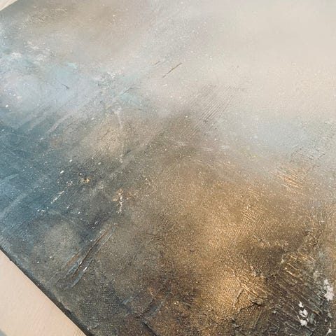 Abstrakt maleri med diverse pastelpaletter. Stort veggkunstverk med moderne design, egnet for innendørs dekorasjon. Maleriet har en teksturert overflate med blandede farger og mønstre.