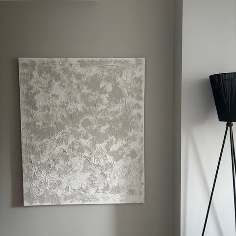 Abstrakt veggkunst i beige og hvite toner. Maleriet har en teksturert overflate med geometriske former. Passer for innendørs dekorasjon sammen med moderne interiør.