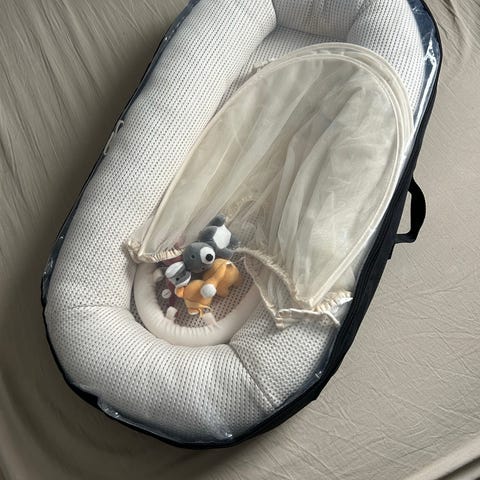 Hjemmesydd stort babynest med Mummimotiv selges. Sydd av meg, ikke perfekt så kantene kan være litt ugjevne. Fylt med vatt og madrassen er av skum som kan tas ut. Silkebånd som går på hele ytterkanten som gjør at du kan stramme opp hele babynestet og lukke det 😊 brukt til et barn og alltid med klut under hode. Ungen gulpeflekker, dyrefritt hjem, ingen røyk og lite bruk av parfyme i huset.