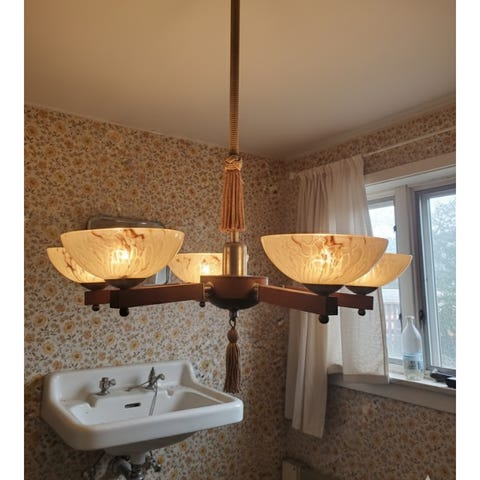 Stilig taklampe i glass, messing og teak fra italiensk Stilnovo, 50-tallet. Hadde tenkt å pusse den opp, og begynte på det elektriske, men ble med tanken.