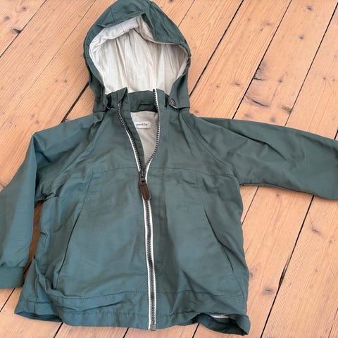 Newbie barnejakke i størrelse 86. Jakken har en fin grønn farge og hette. Den har glidelås foran og er foret med lyst materiale på innsiden. Hel og fin.