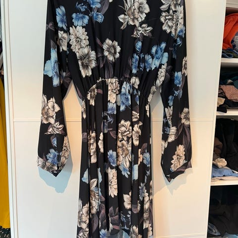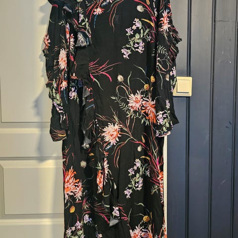 Lindex Andre kjoler kjole i størrelse M for kvinner. Kjolen har en blå basefarge med et blomsterprint i hvitt, rødt og grønt. Materialet er litt gjennomsiktig. men kjolen er merket med vaskeanvisninger. Passer til hverdagsbruk eller mer formelle anledninger avhengig av styling. Knepping foran.