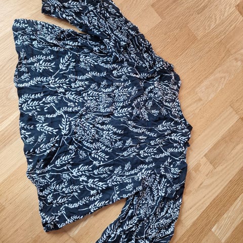 Flott bluse som er pent brukt et par ganger. Blusen har v-hals og smock (strikk) øverst. Den har også smock på ermene som har klokkefasong nederst. 100% viskose. Blusen har litt vid fasong og kan nok også brukes som en S.