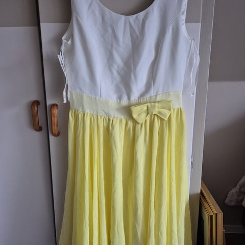 Fargen på kjolen er grønn/ blå (korall) og den er brukt 1.gang. Fått en liten flekk på fremsiden (lår høyde, ikke prøvd fjernet). Det er snøring i ryggen og det følger med eget skjerf/ cape i samme farge. Størrelsen passer en S/M. Stroppene kan endres, ved å flytte på knappene (festet bak)