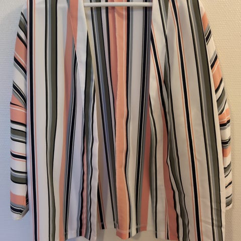 Oransje jakke til å ha på stranda med mønster i blått, hvitt og beige. den har kort erme, dyp utringning og knyting i midjen. Materialet er lett og egnet for varme dager. Aldri brukt.