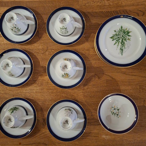 Dette vakre porselenssettet fra Christineholm "Royal Wedding Bouquets" ble laget i forbindelse med bryllupet mellom Kong Harald og Dronning Sonja 29. august 1968.