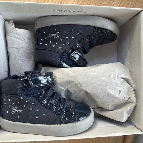 Søte grå joggesko fra Geox i str 20. lukkes med både borrelås og glidelås på siden. De ble for små til datteren vår og er derfor kun prøvd på☺️