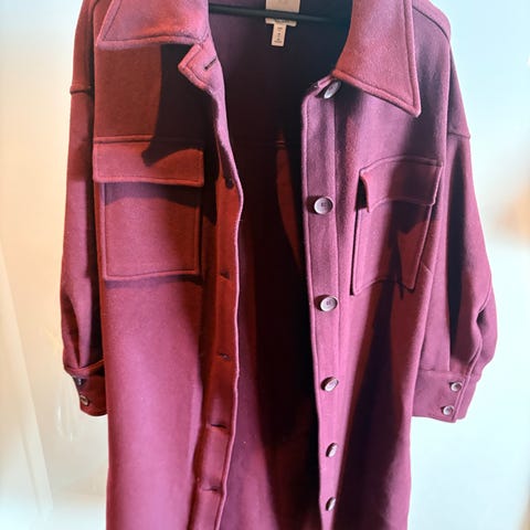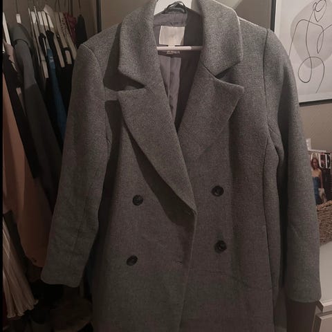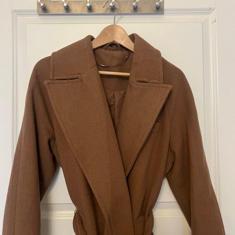 Pent brukt knelang kåpe i ullblanding, med skjult knepping, belte med hemper og stikklommer på siden.