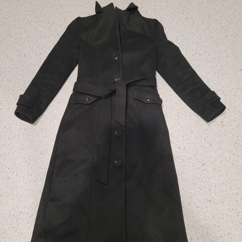 Kåpen har både glidelås og trykknapper.Den har 2 stikklommer.Armlengde 46cm,lengde 108 cm.