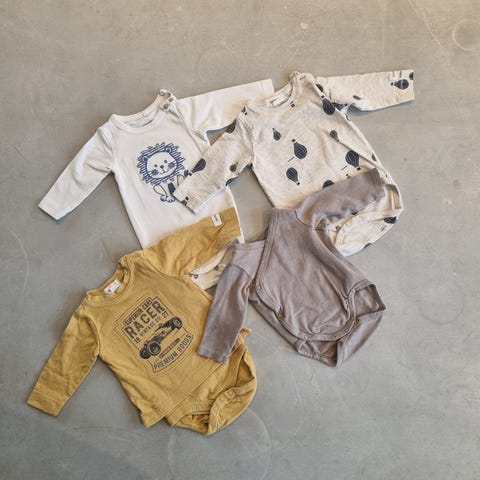 Klespakken inneholder 2 stk Name it bukser (marineblå str. 50, stripete str. 56), Name it genser (str. 56), body i ull og bambus fra Hust and Claire (str. 56). Marineblå bukse og body er brukt et fåtall ganger og stripete bukse og genser er ubrukt, men vasket og av den grunn mangler prislapp.