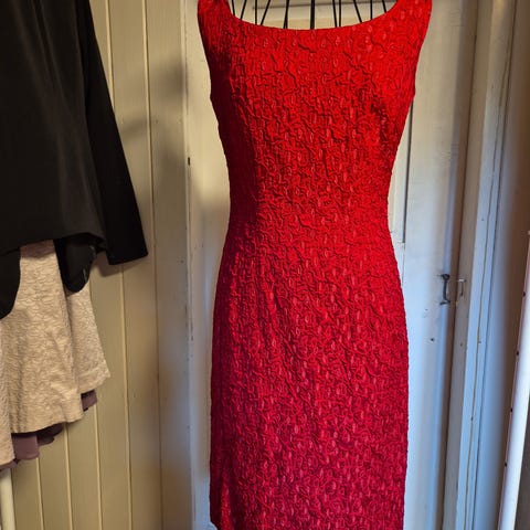 Lekker rød vinterkjole fra Karen Millen i tykt vevet stoff med 65% ull. Nydelig jule / Porsche rød farge, str 14 brukt noen få ganger. Kjøpt på auksjon. Flott fôr inni, dette er en virkelig brukt funn skatt!