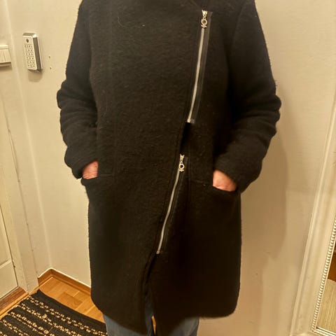 Oversized. Ingen størrelseslapp, men jeg passer den med M/170cm, men den passer sikkert også til L eller kanskje XL. Det kommer bare an på armlengde.
