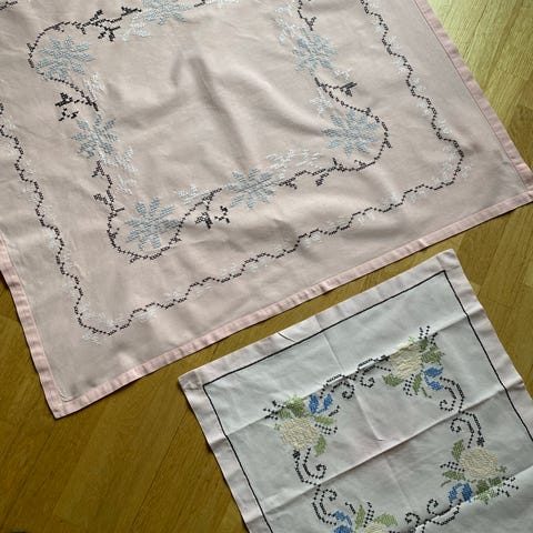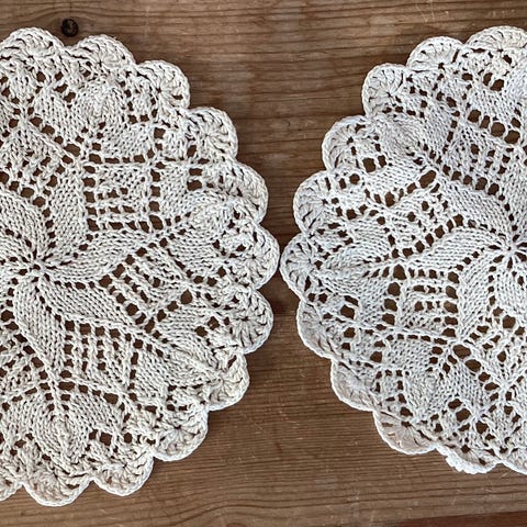 Nydelig strikket rund duk ./ hjerter cry farget