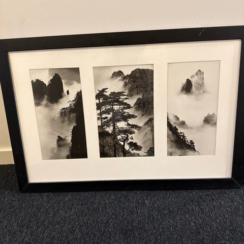 Selger 8 stk bilder/posters med svart ramme (30x40) med bilder av palmer, bølger og en ubrukt. Rammer fra Jysk, bilder fra Desenio. Har fulgt med på et par flyttelass, men ser ut til at alle bilder og rammer er intakte.