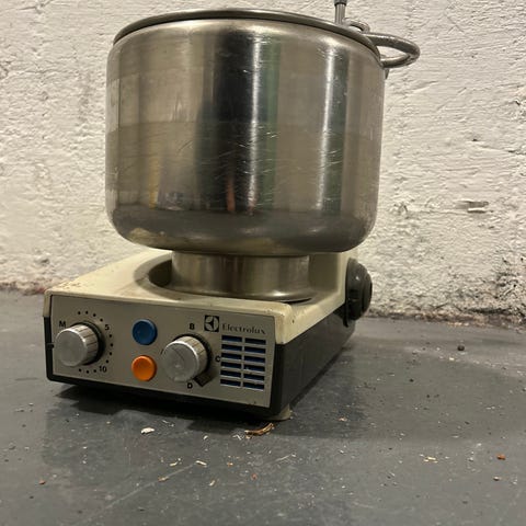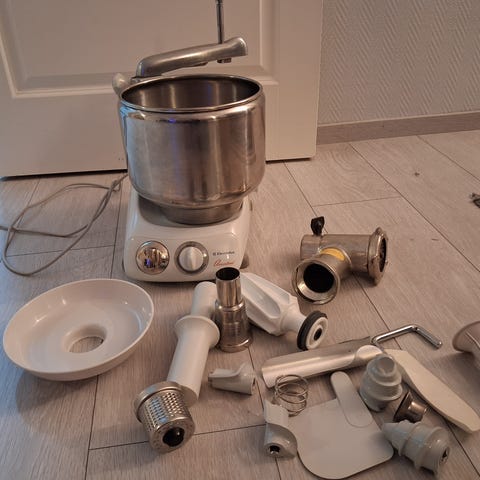 Electrolux assistant deig/eltemaskin av eldre årgang. Utstyr som følger med er avbildet. Fungerer som den skal. Plastlokket er noe bøyd.