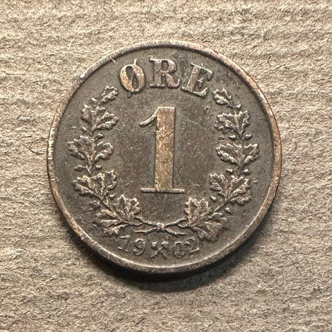 Norsk 1 øre mynt fra 1902 laget av bronse. Mynten har en diameter på ca. 15 mm og viser Norges riksvåpen på den ene siden og verdien '1 øre' omgitt av laurbærkrans på den andre siden.