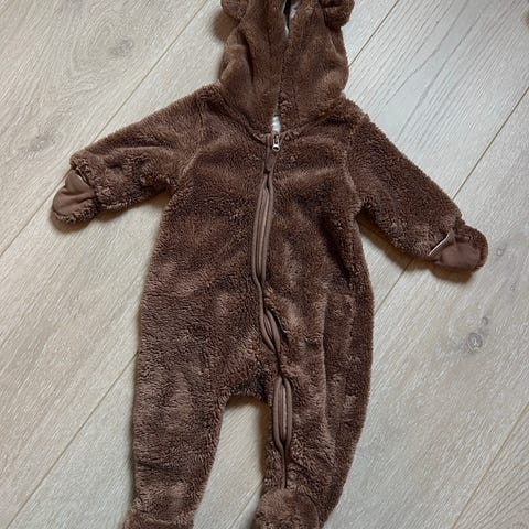 Lindex barnedress i størrelse 62, unisex, i brun farge. Dressen er laget av mykt materiale og har hette. Egnet for små barn.