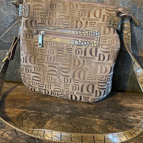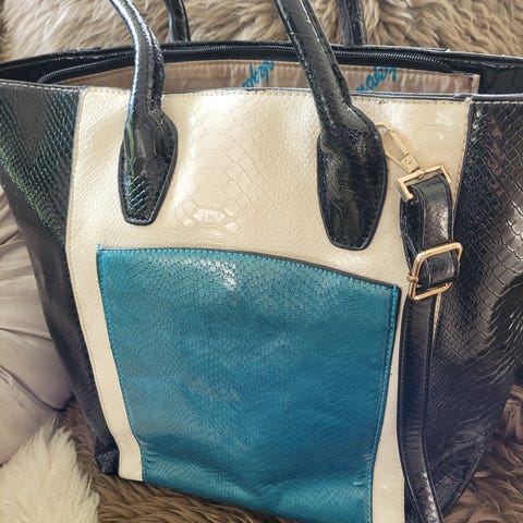 David Jones dameveske i sort lakk med et sentralt panel i slangeskinnsmønster. Vesken har to håndtak, glidelåslomme på utsiden, og et flerfarget blomstermønstre fôr innvendig. Vesken kombinerer svart og blågrønn farge med gullfargede detaljer.