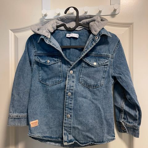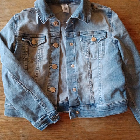 Olajakke for barn i størrelse 122, kjøpt på jenteavdelingen men fremstår unisex. Laget av 100% bomull med klassisk denimstoff. Jakken har trykk knapp lukking, lommer og langermet design. Passer for barn og kan brukes som ytterplagg i ulike anledninger.