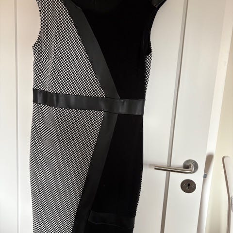 Sort kjole, under knærne, med volang og lys dus rosa kant. Meget pen. Brukt to ganger.