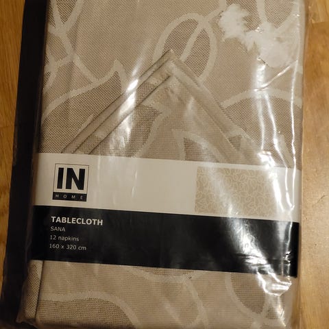 Fin duk til spisebord i 50% bomull, 50 % lin. 11 stk servietter, 28 x 28 cm, hører med. Duken er som ny, tror ikke den er blitt brukt.