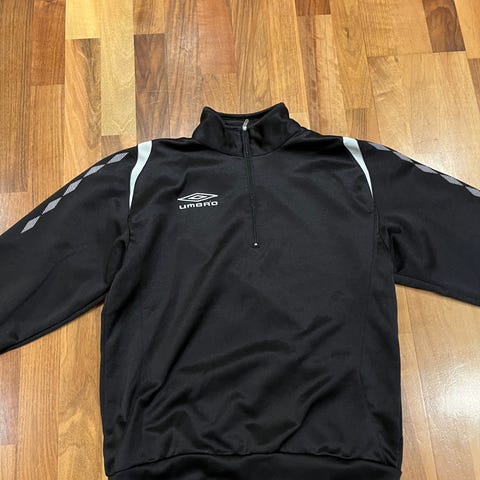 Umbro genser i størrelse S, designet for unisex bruk. Genseren er mørkegrå med hvite detaljer og laget for fotballaktiviteter.